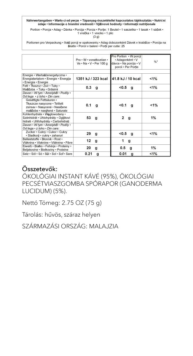 A prémium minőségű organikus kávé luxus kiadása, tiszta, organikus Ganoderma Lucidum spórával kiegészítve. Csak a legnemesebb kávébabok kerülhettek ebbe az ízletes kávéba, mely tökéletes lendületet ad a mindennapoknak. Gondoljon rá egy kiérdemelt luxusként, és fogyasztása alkalmával mindig élje át ennek örömét.
